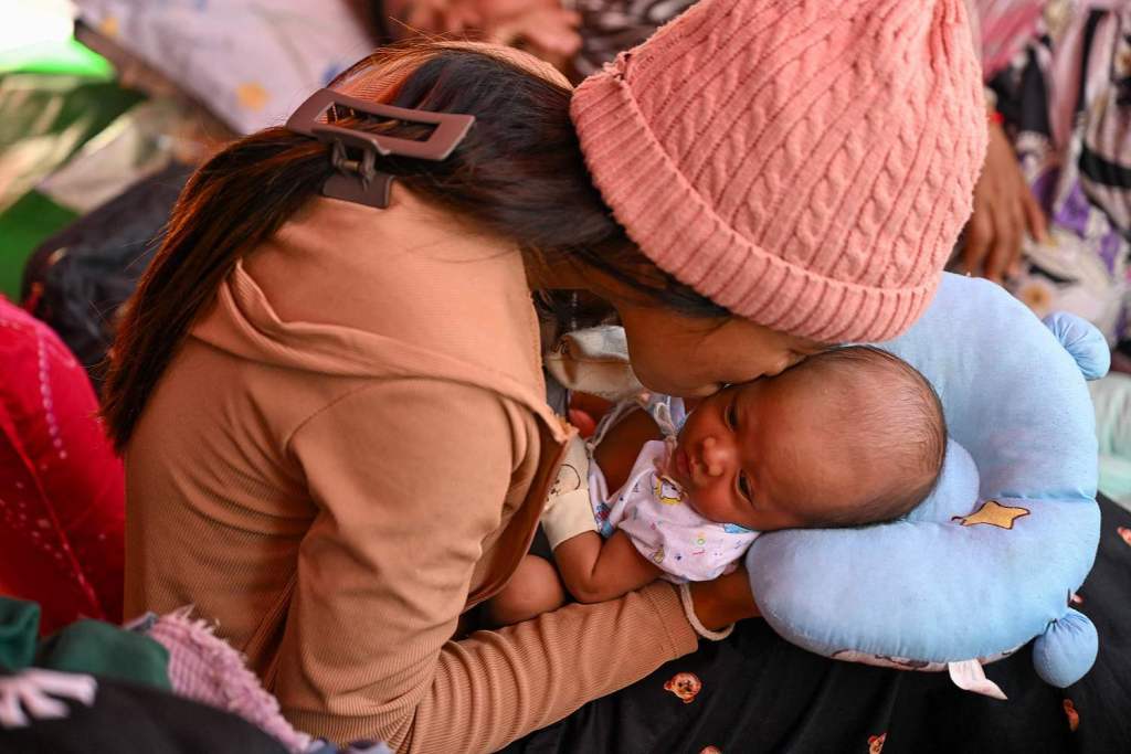 当地时间2025年12月13日,柬埔寨班迭棉吉省,柬埔寨与泰国边境地区发生冲突,一名妇女在流离失所者临时营地亲吻她的孩子。视觉中国 图